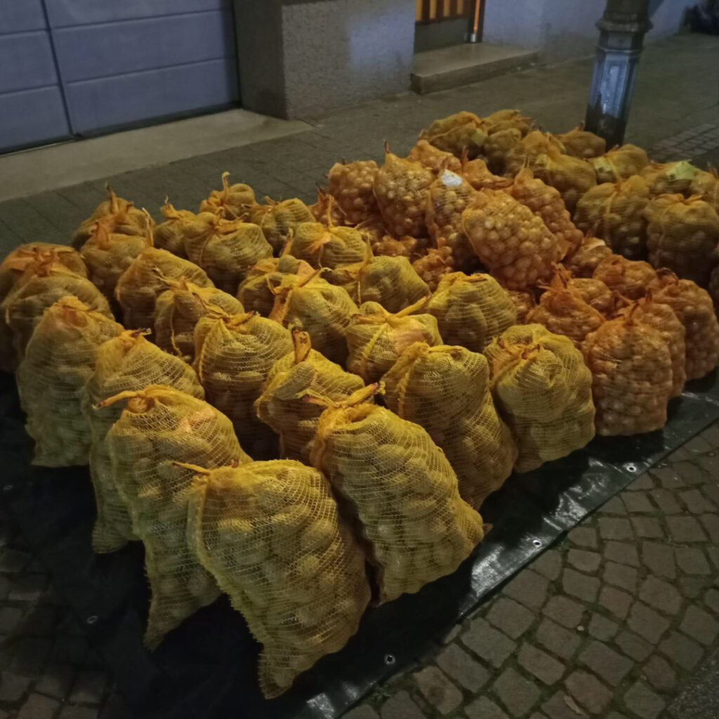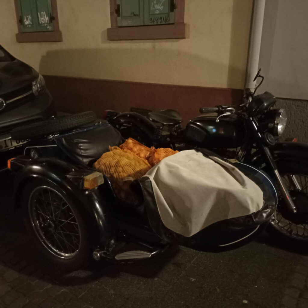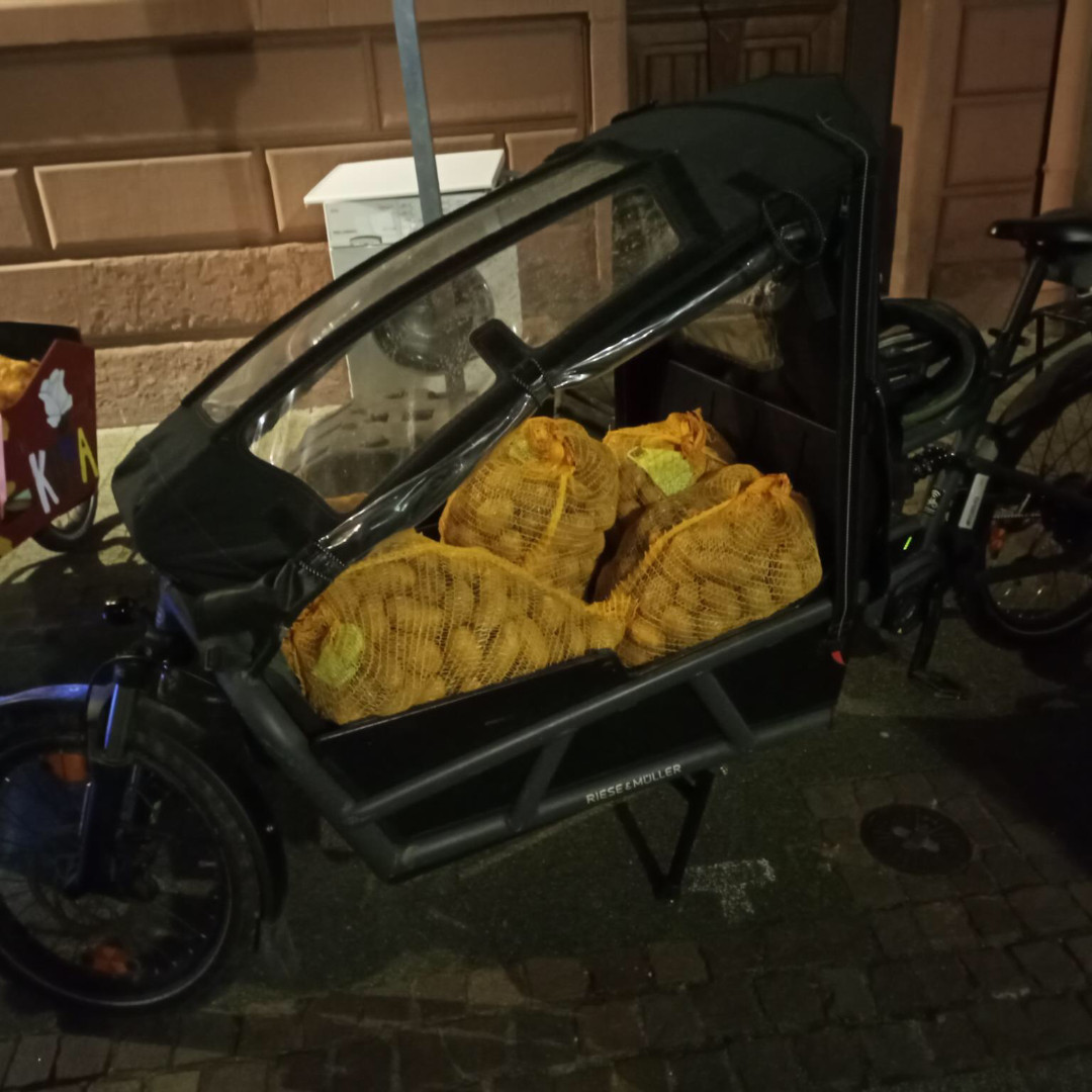 Auch im Jahr 2024 war die gemeinschaftliche Bestellung von Kürbissen, Zwiebeln und Kartoffeln beim Biolandhof Gensheimer in Offenbach bei Landau wieder ein voller Erfolg. Es wurde wieder locker die Mindestbestellmenge von 500 kg geknackt. Daher konnte der Bauer per Laster direkt an den Lagerraum liefern. Punkte für den stilvollsten Weitertransport nach Hause gingen an die Besitzer des Lastenfahrrads und des Motorrads.